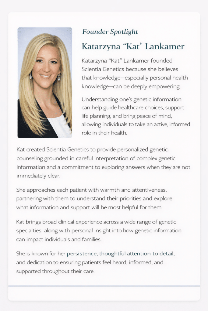 At Scientia Genetics, we believe knowledge is most powerful when it’s accessible. Every session is designed to support your understanding, build confidence, and help you engage meaningfully with your health, now and for years to come.