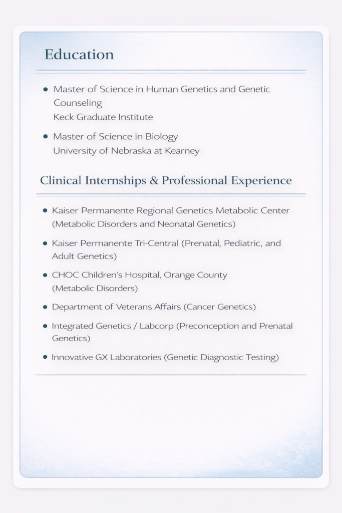 Our board-certified genetic counselor provides personalized, one-on-one guidance to help you discover your genetic story and understand what it means for your health and family. From reviewing family history to exploring testing options and interpreting results, we meet you where you are whether you’re planning for the future, managing health risks, or seeking clarity for your family. We break down complex concepts into clear, actionable insights, empowering you to make informed choices and take proactive steps for your health.